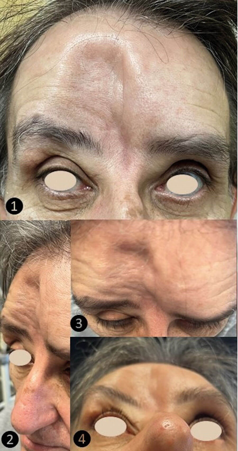 High-energy blunt trauma from a road traffic accident caused comminuted fractures. The bony nasal bridge, superior and medial orbital walls, and a large portion of the frontal bone – completely involving the anterior and posterior walls of the right frontal sinus and partially affecting the left – were destroyed (Figure 1,3). The severe facial and cranial deformity affected the patient’s quality of life and caused psychological distress and social withdrawal. The outcome of surgical reconstruction was excellent (Figure 4).