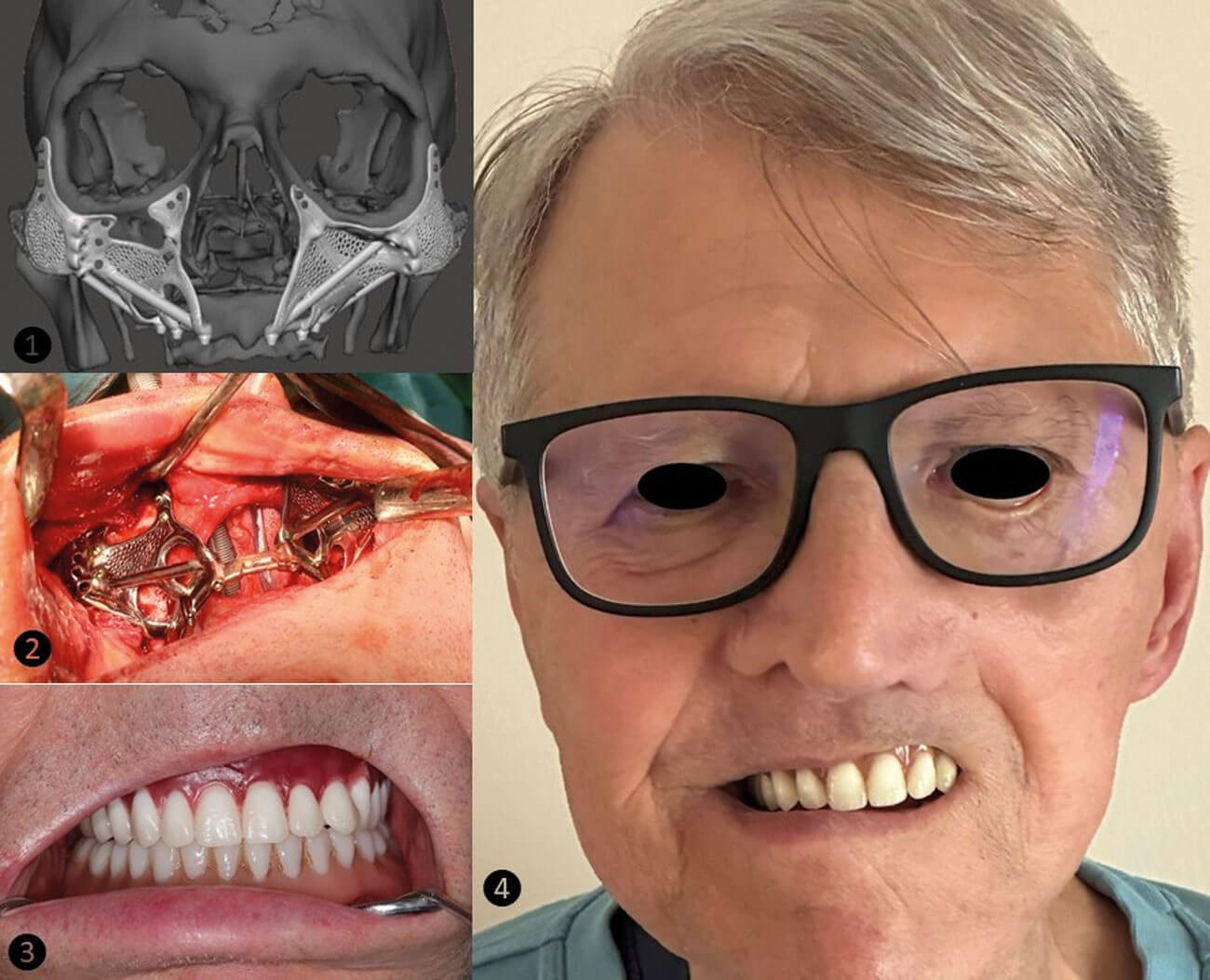 Figure 5: Multiple PSI implants were virtually employed (1) and during the definitive surgery (2) to reconstruct the missing maxillary bones. Dental rehabilitation (3) to restore the hard palate and functions of mastication and speech. The facial appearance of the patient four years post-surgery (4).