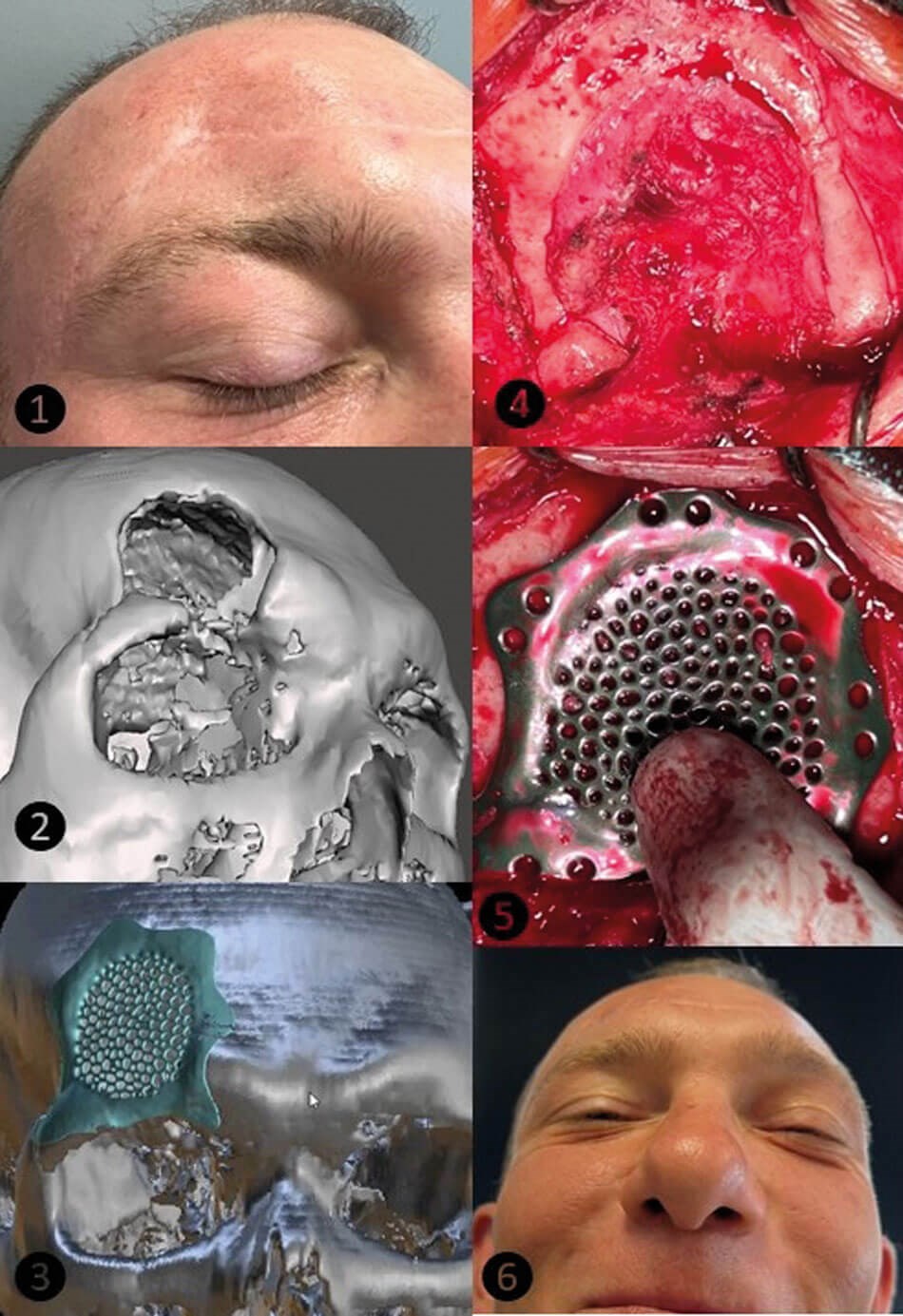 Figure 6: The real-life (1) and virtual (2) images of the frontal bone defect and the extent of the missing bone during surgery (4). The virtual (3) and titanium PSI (5) used for reconstruction. The cosmetic result of the patient’s face after two years of follow-up (6).