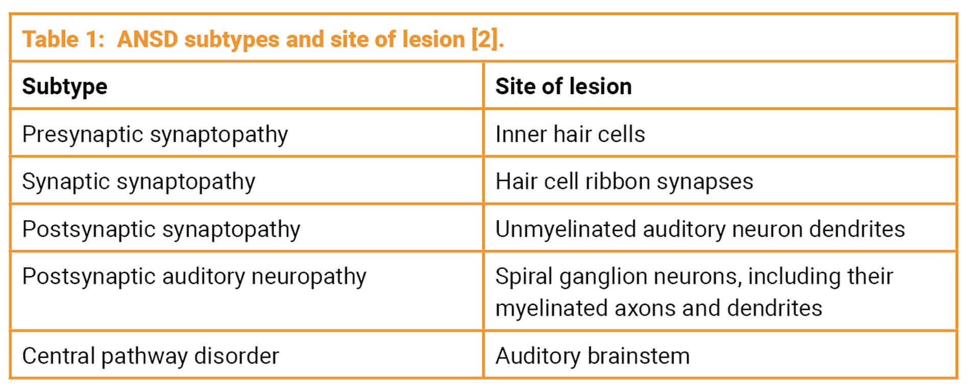 Auditory neuropathy spectrum disorder (ANSD) comprises a group of hearing disorders characterised by abnormal auditory nerve and / or inner hair cell (IHC) function despite preserved outer hair cell function. This leads to relatively preserved audiometric thresholds, but disproportionate difficulties with speech perception.