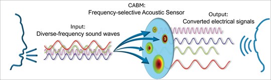 Figure 1: Schematic illustration of frequency-selective acoustic sensing using a PVDF-based circular artificial basilar membrane (CABM), demonstrating bioinspired frequency discrimination (Licensed under CC BY 4.0) [5].