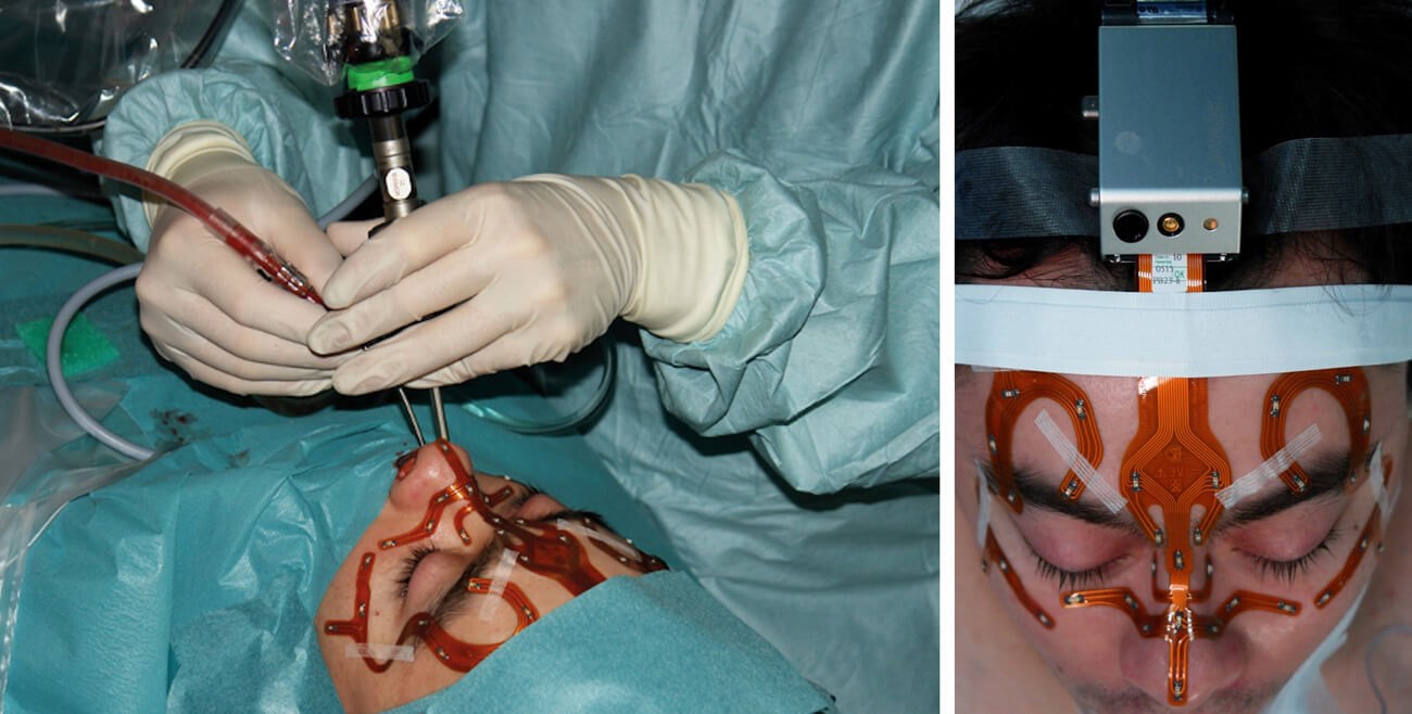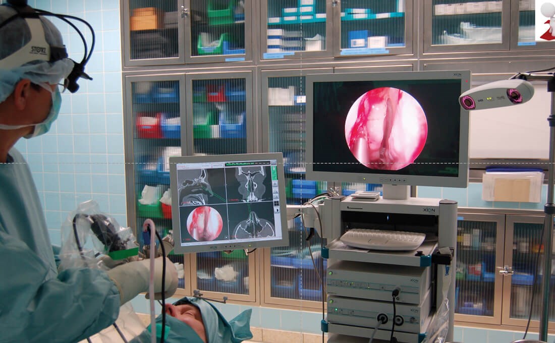 Figure 1: Use of an optical navigation system (Scopis®) during paranasal sinus surgery. The infrared camera receives the reflections of the markers on the patient’s head and on the instruments. (© Oliver Kaschke)