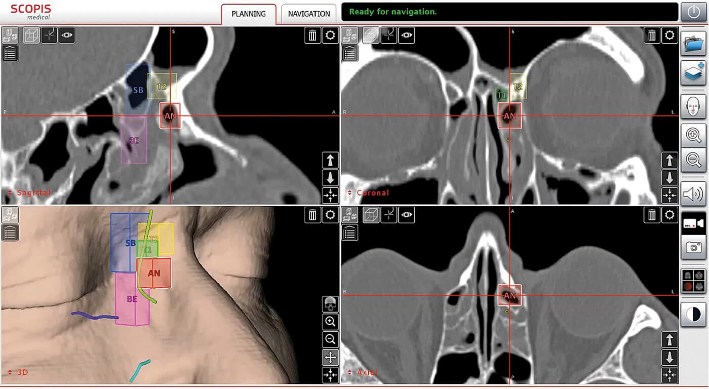 Figure 3: Use of the TGS software to analyse the individual anatomy of pneumatised sections of the paranasal sinuses and for planning paths for surgery (Scopis®). The International Classification of Sinus Anatomy based on Wormald’s Building Block System is used [10]. (© Oliver Kaschke)