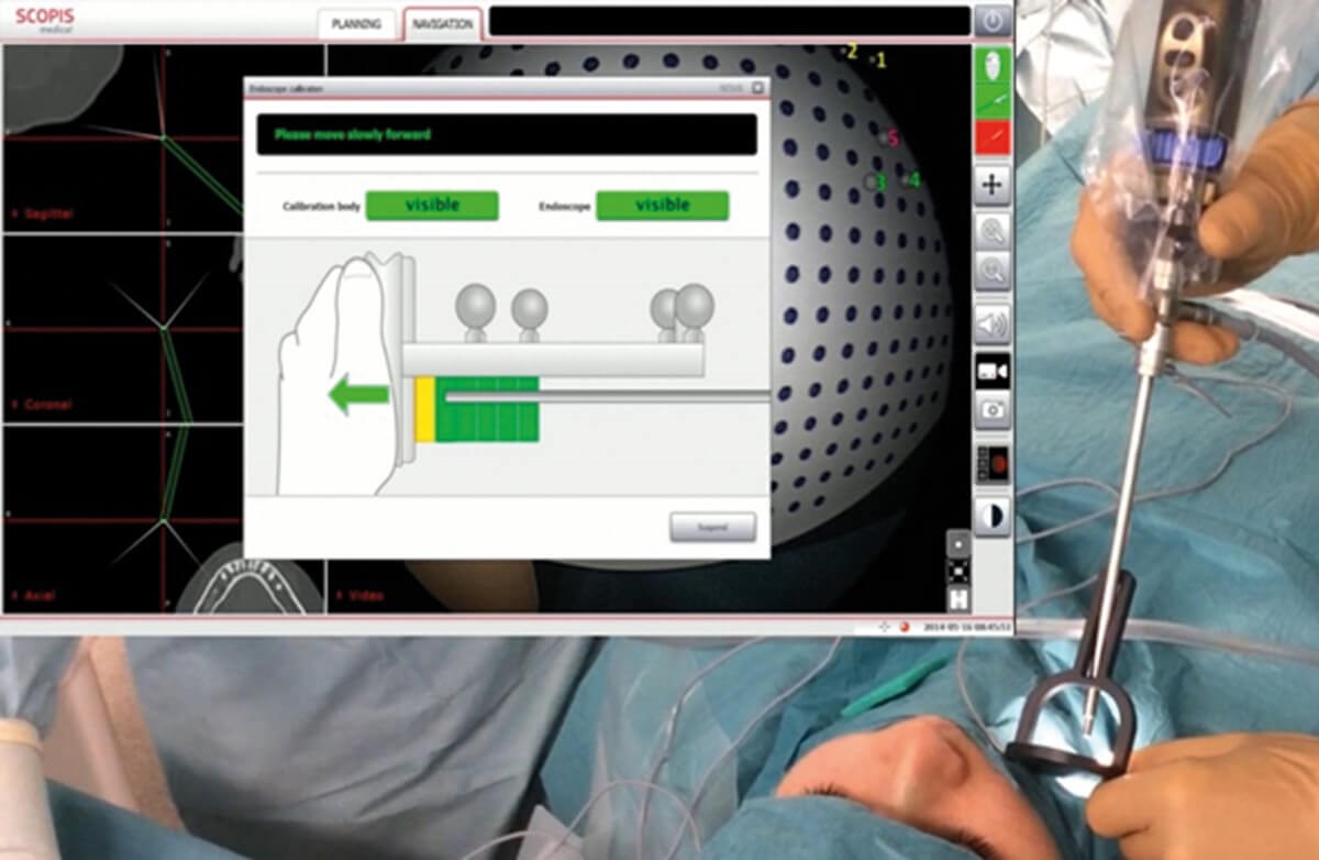 A real innovation in IGS has been the implementation of new software functions within navigation systems. Using dedicated graphical elements in the 3D CT or MRI data set, it is now possible to mark anatomical structures and perform formalised preoperative planning (Figure 3). Anatomical classification systems can be used to systematise preoperative analysis and help minimise risk during surgery [6]. Trajectories (surgical access corridors) and danger zones can be defined during planning and then visualised intraoperatively on the monitor within the endoscopic image. This ‘augmented reality (AR)’ capability was realised, for example, with the navigation system developed by Scopis (Germany; Figure 4).