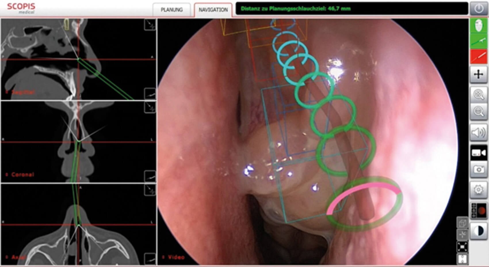 Reliable clinical application is supported by sensors attached near the distal end of instruments, enabling intuitive visualisation of instrument guidance in regions that are difficult to access. By combining software-based analysis of the patient’s individual anatomy with the concurrent definition of target structures using 3D graphic elements, optically controlled guidance can be achieved (Figure 5). Conceptually, this extends navigation to ‘target-guided surgery’ (TGS). Under the leadership of Stryker (USA), further development and commercialisation of the Scopis system is now being realised.