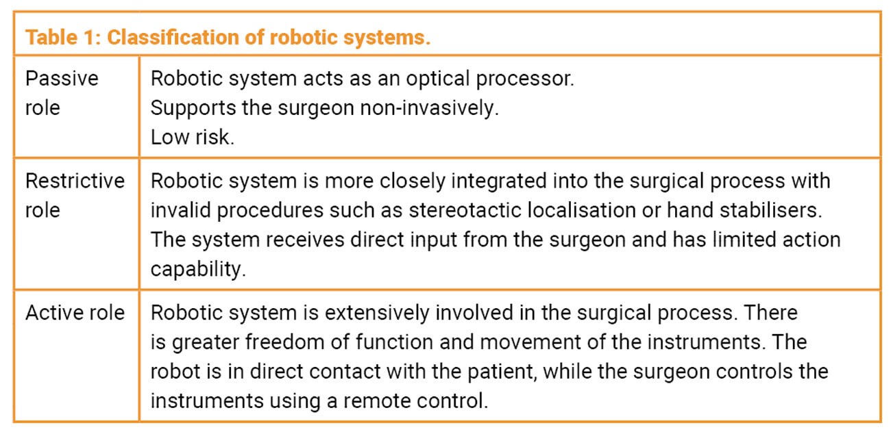 Surgical robots have been used in various forms across several surgical specialties for over 20 years [1,2]. However, it is only relatively recently that they have been routinely used in otorhinolaryngology. Surgeons need a basic understanding of the general principles of robotics to grasp and utilise the tasks and complexity of robotic surgical systems. A role-based classification of robotic systems facilitates the necessary interdisciplinary dialogue between engineers and physicians (Table 1) [3].