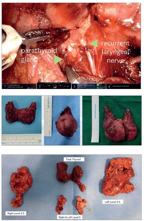 With increasing experience, we have expanded the indications to include thyroid malignancies, performing central compartment clearance and, when indicated, lateral neck dissections without compromising oncological principles. Over nine years, we have addressed enlarged thyroid glands up to 11 cm via this technique. We further combined this approach with robotic-assisted thoracoscopic surgery to excise thyroid tumours with mediastinal extension – procedures that would otherwise have required a sternotomy. We have used the same approach to address recurrent nodal disease or thyroid bed recurrence or to perform completion thyroidectomy. All thyroid operations are performed along with intraoperative nerve monitoring, with positive outcomes.