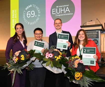 The EUHA Sponsorship Award is now in its 15th year and has served as a career springboard for previous winners. The 2025 award The EUHA Sponsorship Awards 2025 went to three young scientists (pictured above): 1st place to Jonas Weber (TH Lübeck) – ‘Development of a suitable metrological test for adaptive directionality in hearing aids’; 2nd place to Lea Hackenberg (TH Lübeck, German Hearing Aid Institute) – ‘Determining the influence of in-situ measurement on the transmission behaviour of hearing aids’ and 3rd place to Dr Chen Xu (University of Oldenburg) – ‘Crucial Elements of a Virtual Hearing Clinic on Mobile Devices: Psychophysics, Diagnostic Parameter Estimation, and Validation’